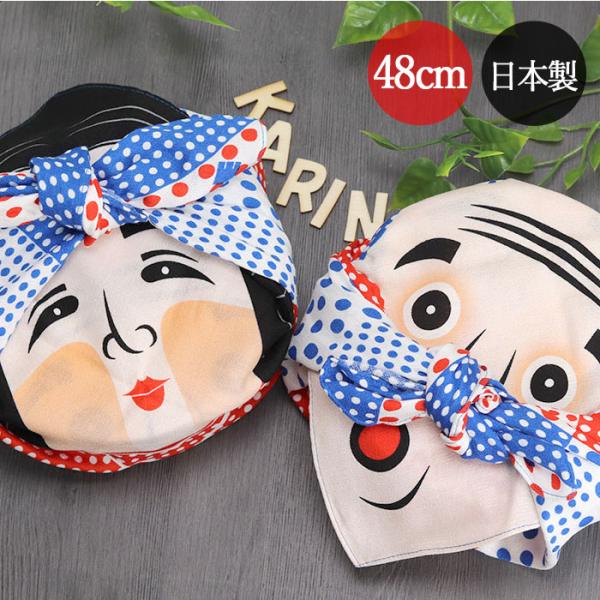 風呂敷 中巾 チーフ おかめ・ひょっとこ ブルー 48cm ふろしき ナフキン ランチクロス 綿100% ( お土産 包み ハンカチ )